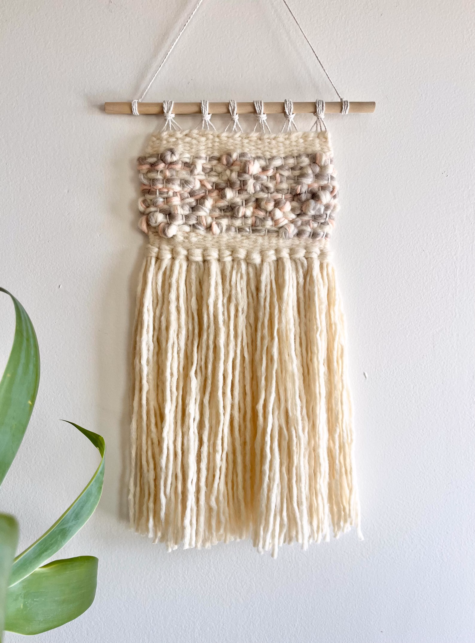 Add a touch of warmth and texture to your space with this stunning handmade wall hanging, crafted with love and care in a tiny studio on wheels. This piece blends soft pink, grey, and cream yarns to create a beautifully modern and textured design that will elevate your home decor. Its handcrafted nature ensures that each wall hanging is unique, offering a personal touch to any room.